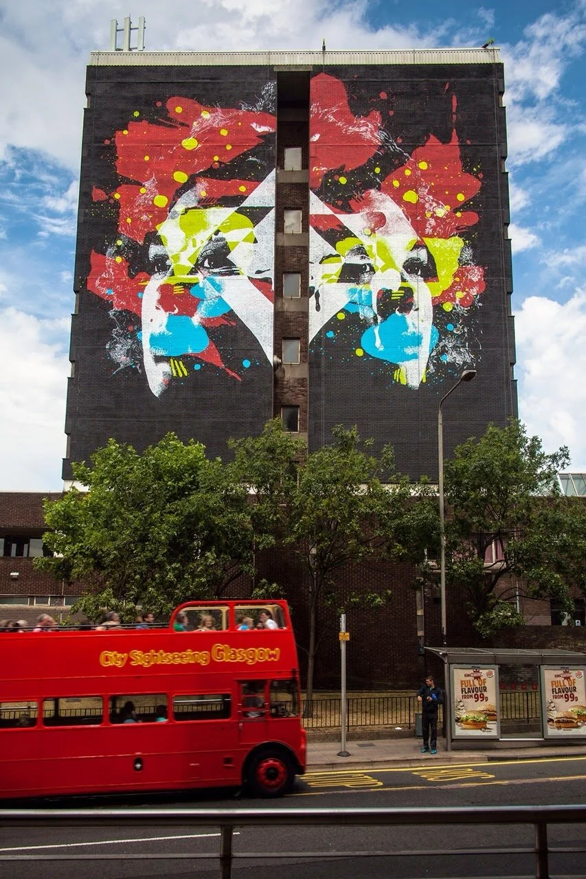 The process of making this kind of artwork is very specific. Firstly, 1010 picks a pattern which reflects the building it is painted on, so the mural would fit perfectly on the wall, looking as if it has been created naturally over time. 1010 works out from the dark centre of his image, layer by layer, to reach the lightest shades of colour on the periphery of his piece creating breathtaking shapes that burrow their way into the sides of buildings creating mural which joyfully plays with time and space.